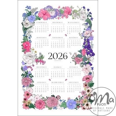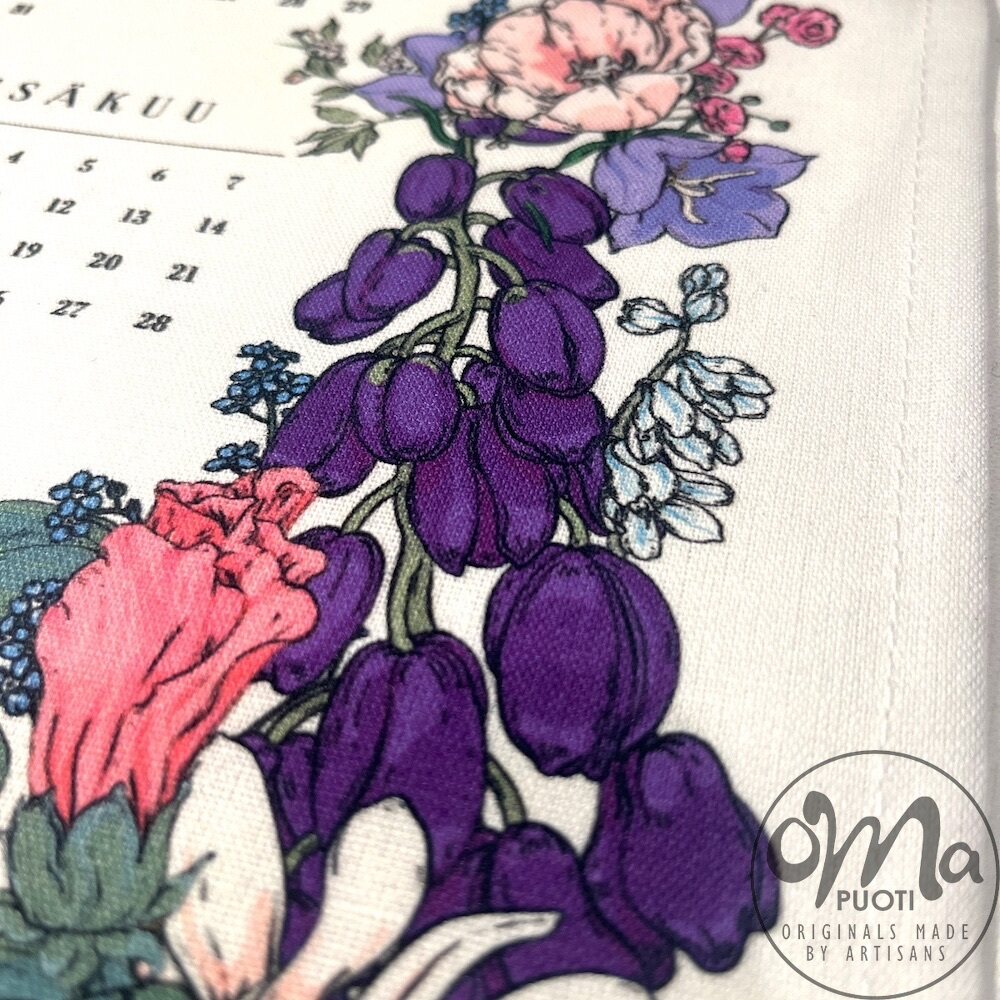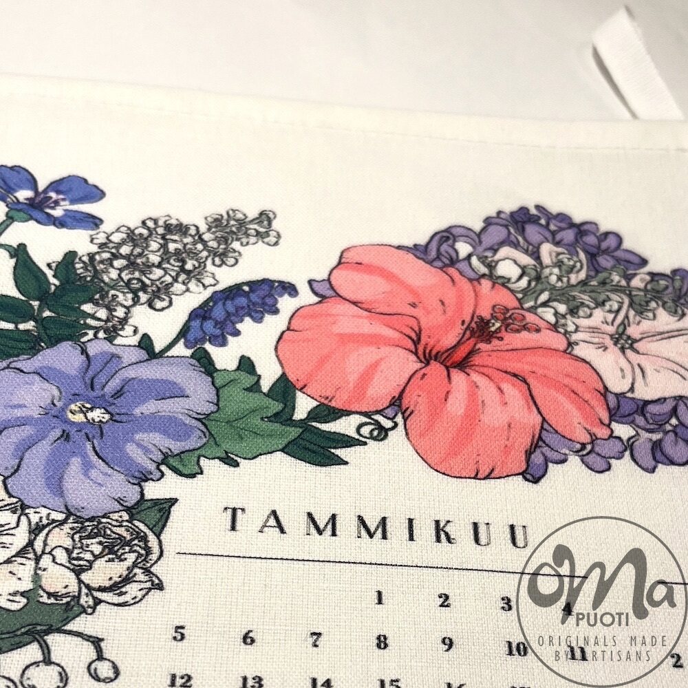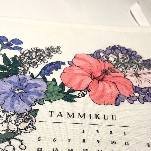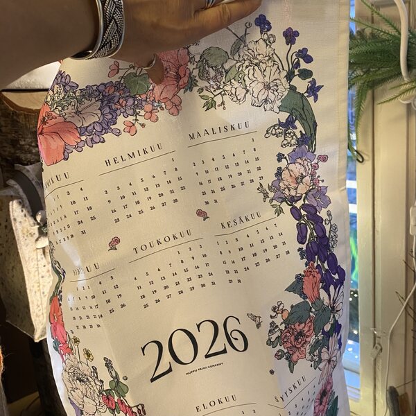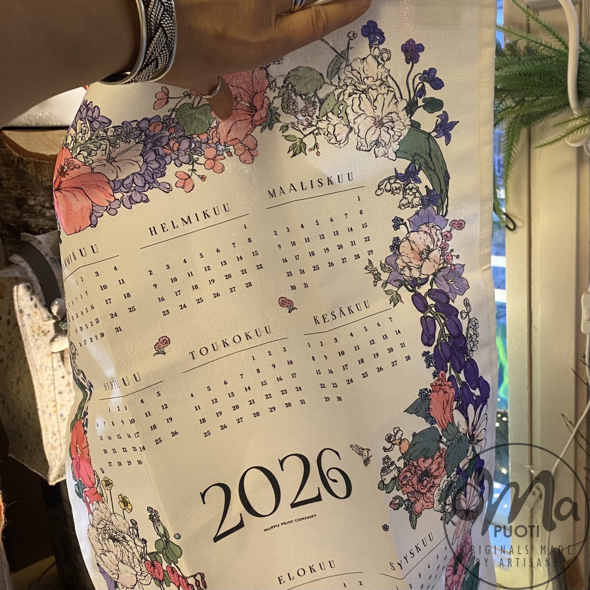 Kalenderhandtuch für 2026, entworfen von Satu Kontinen. Bedruckt mit Reaktivfarbstoffen auf hochwertigem Halbleinen.