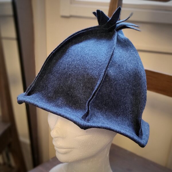 Der Durchmesser am unteren Rand des Hutes beträgt etwa 27,5 cm, die Höhe etwa 20,5 cm. Farbe: Dunkelblau.