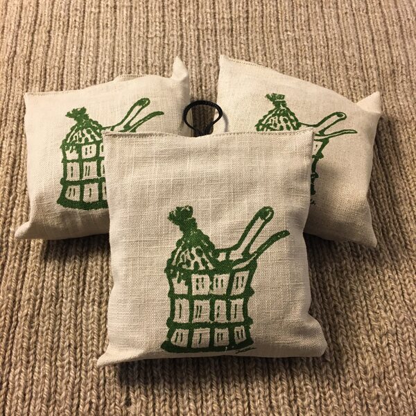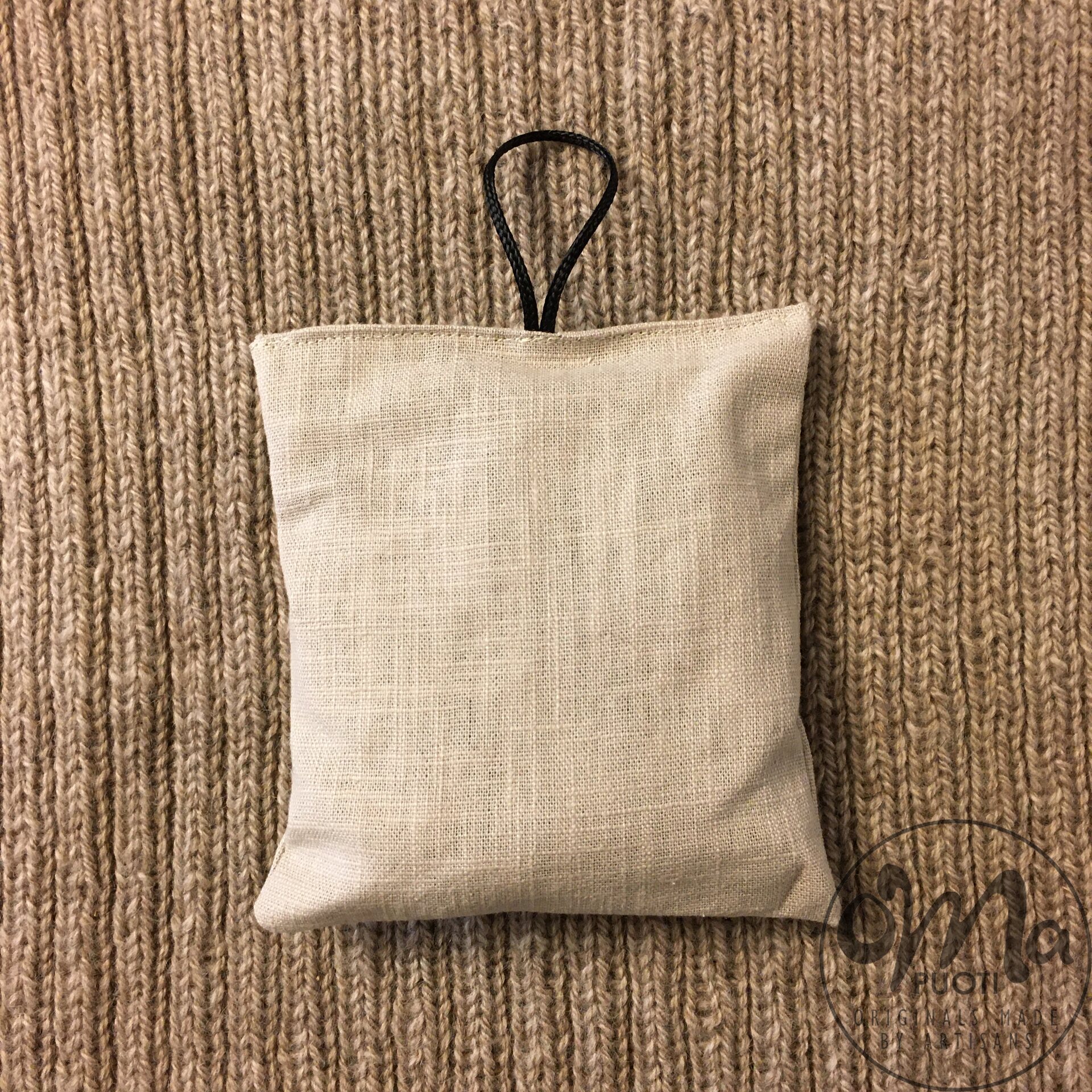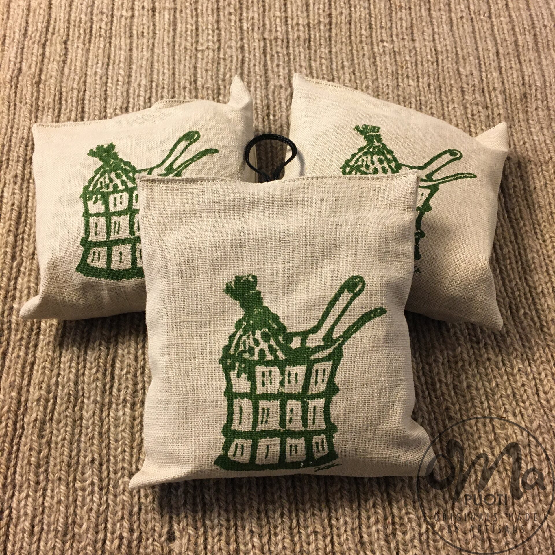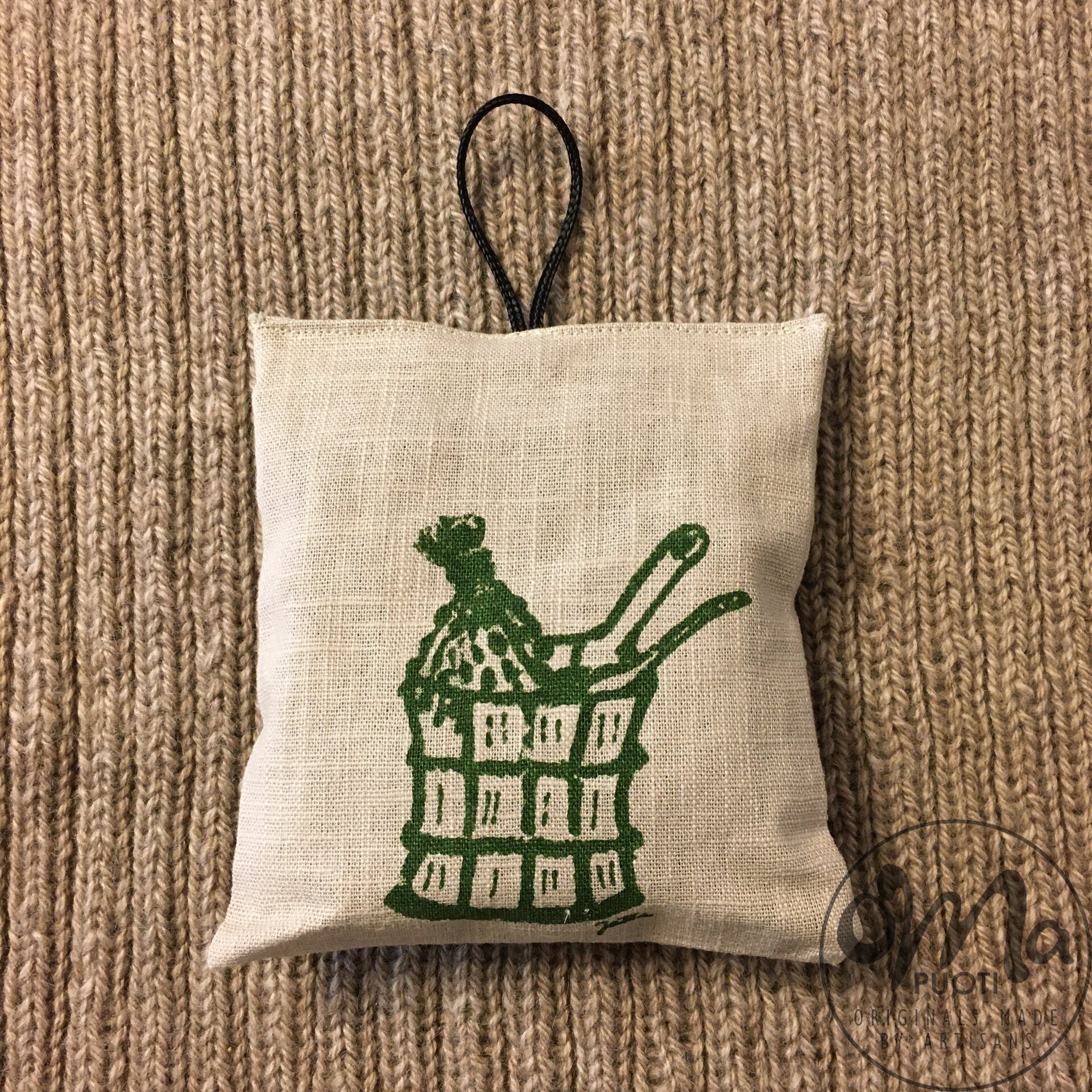 Kangas puuvillaa/pellavaa. Pussin sisällä kuivatettuja koivunlehtiä.